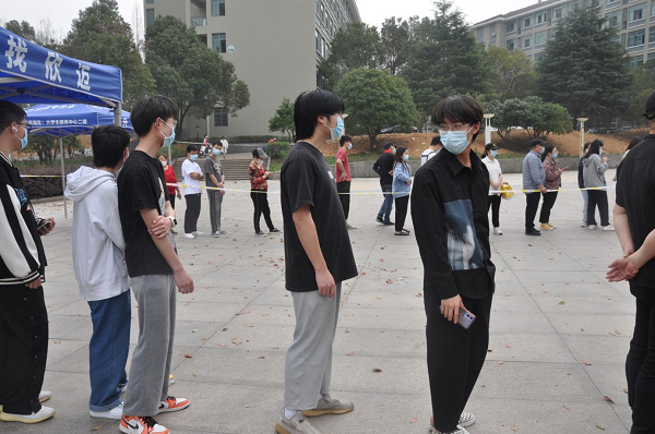 现场设置单向出入口,检测通道设置等待区、登记区、采样区等区域。师生员工错时错峰,全程佩戴口罩,间隔一米排队,在工作人员和志愿者的引导下,有序扫码,依次进行核酸检测,即采即走,检测工作快速、有序开展。