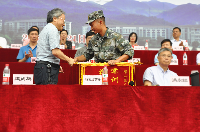 最后,由院长魏贤超为新生致词,魏院长在讲话中,首先对3600余名2018级新同学的到来表示热烈欢迎,向指导军训的教官表示衷心感谢,向顺利完成大学第一课军训的同学们表示祝贺!他指出,大学在于“大”与“高”两个核心,大学的“大”与“高”不在于大学校园里大楼的“大”与“高”,不在于大学食堂的“大”与“高”,不在于同学们生活费的“大”与“高”,不在于同学们电脑、手机的配置水平的“大”与“高”,而在于大学里老师的学术能力的“大”与“高”,在于同学们通过在大学学习后,所蕴含的内心世界、精神境界、格调品味、学术水平、涵养气魄的深度、广度和宽度。他希望同学们珍惜大学美好时光,确立自己的大学目标,提高对自我的要求,并祝福同学们未来更加美好。
