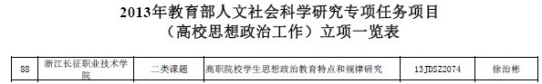 根据教 育 部 司 局 函 件(教社科司函[2013]88号)关于2013年度教育部人文社会科学研究一般项目立项通知,我院教师徐治彬主持,张义莎、张红星、姬磊、秋美、朱泽忠、王莉、李林军、胡旭华等老师参加的“高职院校学生思想政治教育特点和规律研究13JDSZ2074),荣获2013年教育部人文社会科学专项任务项目(思想政治教育)立项,项目经费2万元。