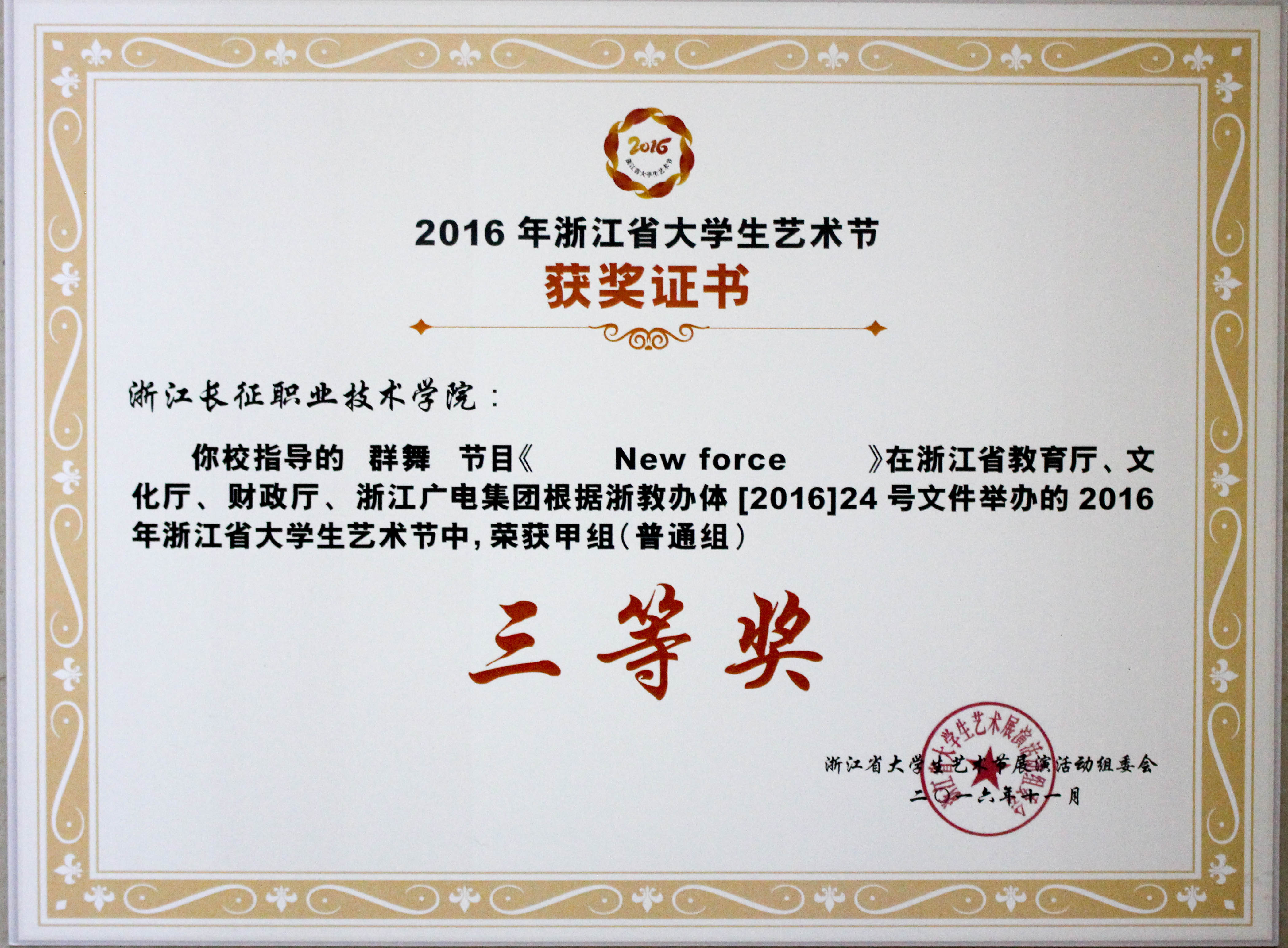 在省教育厅、省文化厅、省财政厅、浙江广播电视集团共同主办的2016年省大学生艺术节中,我院选送的小品《感恩》荣获戏剧类甲组三等奖;群舞《New force》、《恋人心》、《我们的故事》等3个节目荣获舞蹈类甲组三等奖。(团委供稿)