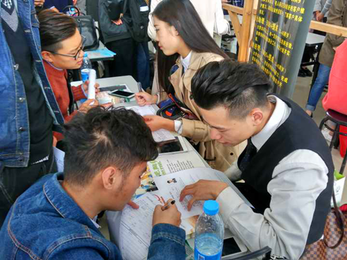 招聘会于下午1:30时开始,前来应聘的学生络绎不绝,大厅里人头攒动,招聘摊位前同学们或凝神浏览招聘简介、或咨询招聘人员相关情况、或三两同学商量探讨、或签订初步意向协议……。过程中写在同学脸上的既有应聘前的紧张、不定,也有应聘后的释然、兴奋。