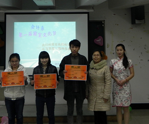 为了丰富学生寝室文化,营造良好的寝室氛围,创造一个干净、舒适、整洁、卫生、文明的住宿环境。会计系2014年12月29日晚18:30分在1218教室举行了会计系首届“寝室文化节”比赛。担任此次活动的评委有会计系党总支书记杨军老师,杨小娟老师,学生会主席温作满,寝管会会长陶磊,外联部部长施超勇,卫生部部长吴媛媛。