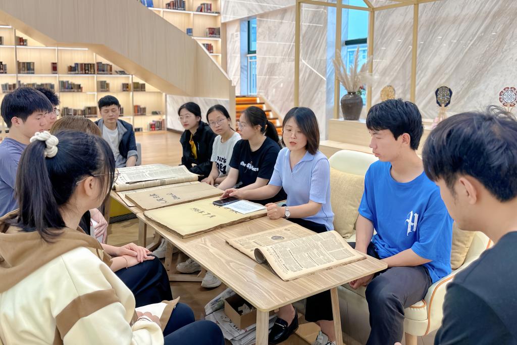 首先,师生共同传阅了馆内珍藏的六七十年代的《解放日报》《人民日报》《浙江日报》等老报纸。一张张泛黄的报纸记载着充满浓厚时代特征的新闻报道。任建东老师为同学们讲解了旧报纸的排版、印刷知识及新旧报纸的差异。李春辉讲述了这些老报纸在图书馆改造期间意外发现的过程,她表示,这些报纸承载着中国的记忆和成长,凝聚着中国人的精神与情怀,透过报纸,我们能够见证时代的变迁,社会的发展。