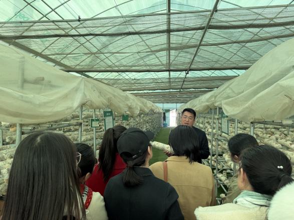 在沈建强的带领下,全体党员走进菌菇大棚,开启“乡村振兴实地研学”之旅。大棚内恒温恒湿的环境里,层架上整齐码放的菌包正孕育着新鲜菌菇,沈建强手持成熟的杏鲍菇,向教职工党员们细致讲解种植技术。党员们俯身观察菌菇生长状态,不时交流提问。