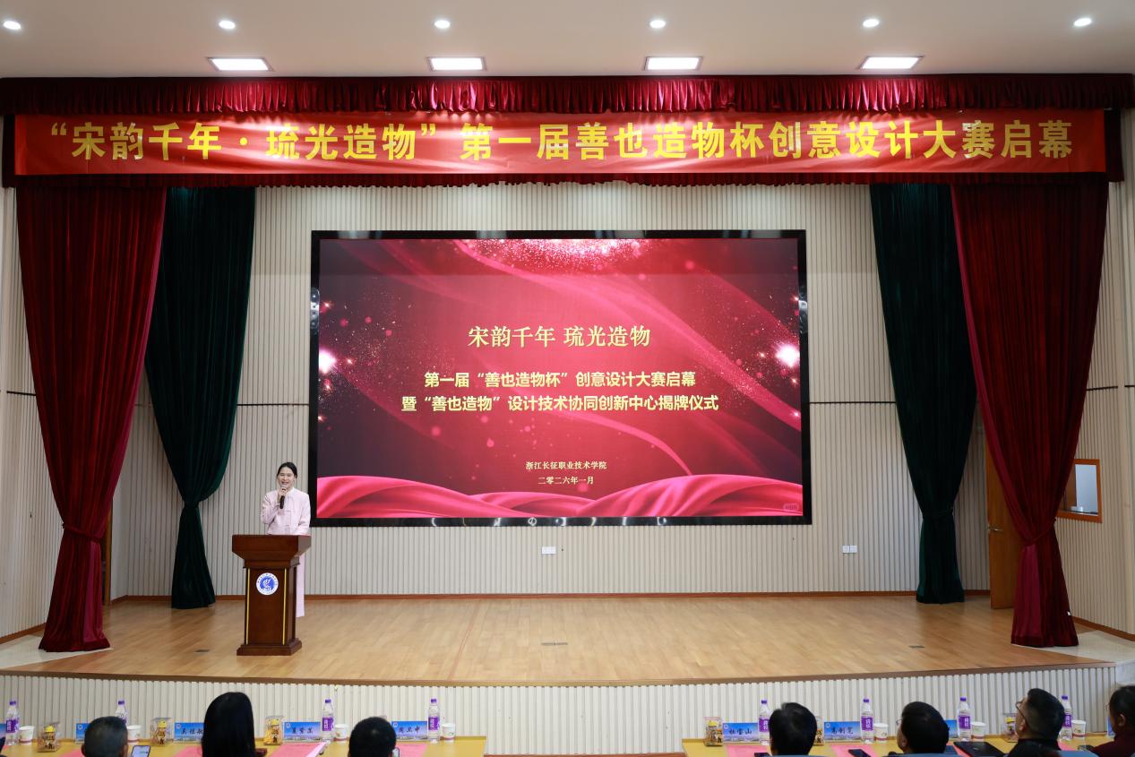 1月7日,“宋韵千年・琉光造物”第一届善也造物杯创意设计大赛暨“善也造物”设计技术协同创新中心揭牌仪式在浙江长征职业技术学院第二报告厅隆重举行。浙江省文化创意产业协会秘书长周卫中,浙江省非物质文化遗产保护协会理事、杭州善也文化创意有限公司负责人夏紫菡,浙江省陶瓷行业协会副主席吴煜敏,浙江省书法家协会理事金耀耿,浙江省知识产权成果转化专家方红军,浙江长征职业技术学院副校长杜宝山、高创宽、冯新红及相关师生代表齐聚一堂,共同见证这一意义非凡的时刻。